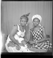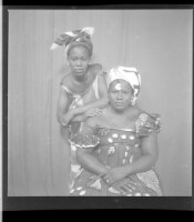 Two women, in the foreground a woman sits on a chair wearing a tussu dress, a headscarf, and coins, arms crossed, in the background a woman wears a dress, a headscarf, and earrings, arms crossed and facing forward