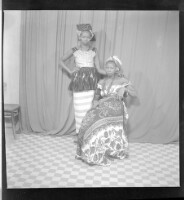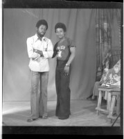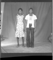 Full portrait of two women, to the left one is standing wearing a black camisole, a white loincloth skirt, and a headscarf, they hold each other, to the right a woman sits on a chair wearing a grey dress and a necklace, facing forward