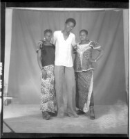 Full portrait of three people, to the left a young woman standing wearing a black t-shirt and a loincloth skirt, in the middle a young man standing wearing a white shirt and grey pants, to the right a woman wearing a camisole and a black loincloth skirt,