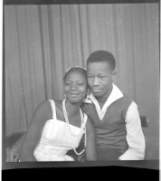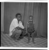 A young girl wearing a white dress, a white head wrap, and a white necklace sitting with a man wearing a white shirt and black t-shirt, both face-forward in the studio.