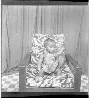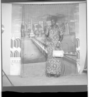 Copy of a full portrait of five people, a man standing, wearing a blue shirt, a white suit, and black pants, and a woman sitting wearing a tussu dress, a headscarf and a necklace, with a baby wearing all white, a little girl wearing a camisole and a neckl