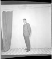 Full portrait of two people, to the left a young man kneeling, wearing a white short sleeve shirt and pants, and a little boy standing, wearing all black, facing forward
