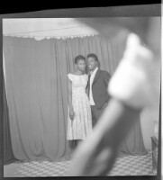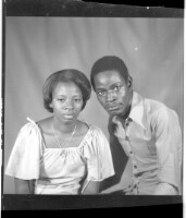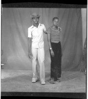 A young girl wearing a grey t-shirt, black pagne, a watch, and earrings standing with a young man wearing a white shirt and a hat, both face-forward in the studio.