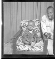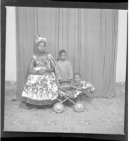 A woman wearing a dress and head wrap sitting in profile next to a boy wearing a boubou standing face-forward and a little girl sitting face-forward in a crib in the studio.