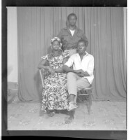 A man wearing a shirt and pants sitting in profile next to a girl wearing a dress, head wrap, and necklace sitting face-forward in front of a man wearing a shirt and pants standing face-forward in the studio.