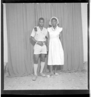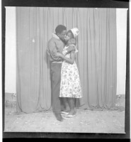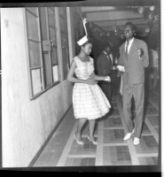 Young people dancing in a foyer: in the front of the photo and young couple, a girl in a dress and white headscarf and necklace dancing with a man smiling wearing a white shirt and suit, in the background two men dancing in suits and white shirts in the