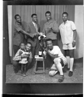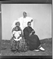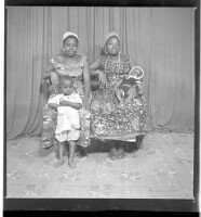 A little boy standing in profile in front of two women wearing dresses, head wraps, and necklaces, one holding a baby in her lap both sitting face-forward in the studio.