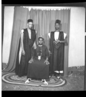 Full shot of three men, two standing in white and black boubous and black Fez hats and watches, one in the middle sitting wearing a black boubou and hat with a flower pot around his neck facing forward in the studio.