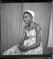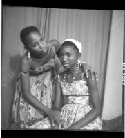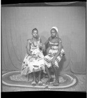 Two women sitting, the woman on the left wearing a camisole, pagne, white head wrap, and a necklace and the young girl on the right wearing a dress, earrings, and a necklace with her hair styled, and a glimpse of some writing on the fabric of the dress of