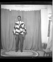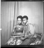 A woman wearing a black and white dress, a head wrap, a necklace, and earrings sitting with a man wearing a white long-sleeved shirt, a watch, black pants, and black shoes with his foot on a chair, both face-forward in the studio.