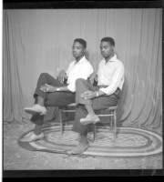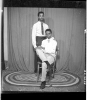 Two young men, one sitting on a chair with his legs crossed and the other standing wearing a white shirt, black tie, and black pants, both face-forward in the studio.