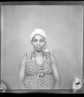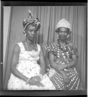 Two women sitting, the one on the right wearing a white dress, earrings, a black head wrap, and a necklace, and the other one wearing a camisole, white head wrap, a pagne, and a necklace, both face-forward with their arms crossed in the studio.