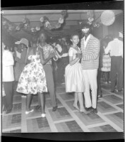 A young girl wearing a dress with her hair styled facing backwards with a young man wearing a shirt, pants, and black shoes, and another a young girl with light skin wearing a white dress dancing with a young man wearing a white shirt, a suit coat, white