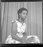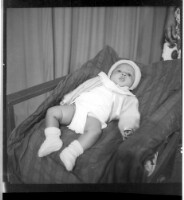 A woman wearing a black and white dress, a white head wrap, a necklace, and earrings sitting face-forward on a stool with a baby wearing a t-shirt and shorts in all white in the studio.
