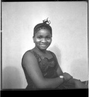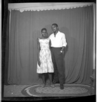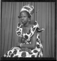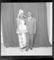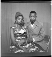 A woman wearing a camisole with a glimpse of the word Ghana and an unidentifiable photograph on it, a pagne, a head wrap, and a necklace standing face-forward with a young man wearing a white shirt and black suit in the studio.