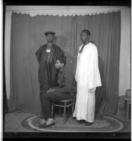 Three men, the one standing on the right wearing a black boubou, the one standing on the left wearing a white boubou, and the one sitting on a chair in the middle wearing a black shirt and black pants, all face-forward in the studio.
