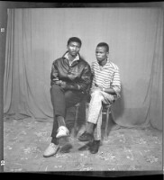 Two men sitting face-forward, the one on the right wearing a white and black long-sleeved shirt and black pants, and the one on the left wearing a shirt and pants of the same colour, black shoes, and a watch in the studio.