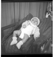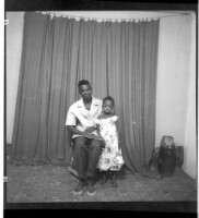 A young girl wearing a fabric dress and a necklace with her hair styled sitting face-forward on a chair with a man wearing a white shirt, black suit, and white shoes in the studio.