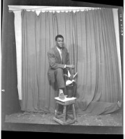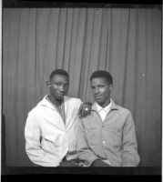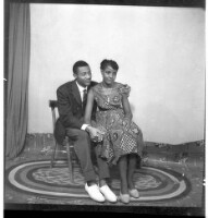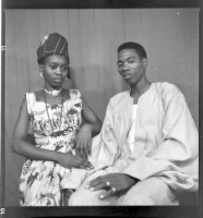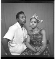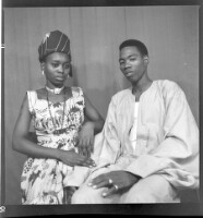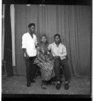 A man wearing a shirt sitting next to a woman wearing a dress, head wrap, and necklace, both face-forward with a man wearing a shirt and pants standing in profile beside them in the studio.
