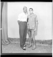 A man wearing a shirt, pants, and a hat standing next to another man wearing a shirt and shorts, one face-forward and the other in profile in the studio.