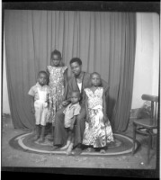 A man wearing a boubou holding a child in between his legs and sitting in profile, with two girls and a little boy standing face-forward next to him in the studio.