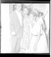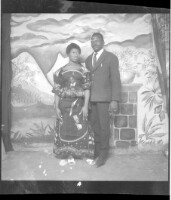 Full shot of a couple, on the left a woman standing wearing a black camisole and pagne and hairstyle, with a man standing wearing a shirt and black suit in the studio.