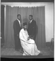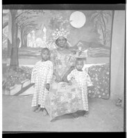 Full shot of three, a woman sitting wearing a grey boubou and headscarf with two little boys standing on her either side wearing black and white boubous.