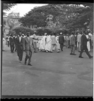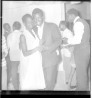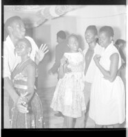A man wearing a shirt and pants holding a girl wearing a dress, head wrap, and necklace, both standing in profile in front of several people in a room.