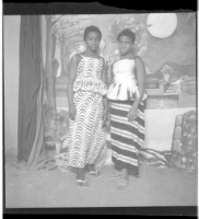 Full shot of two young girls standing, on the left wearing a camisole and pagne and on the right wearing a camisole and black and white pagne in the studio.