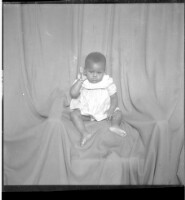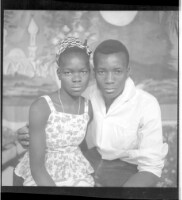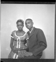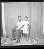 Full shot of two people standing, on the right a woman wearing a camisole and black and white pagne and headscarf and necklace next to a little girl wearing a dress and headscarf in the studio.