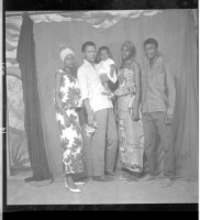 Two men in dress shirts and pants, one in glasses holding a baby all standing in profile between two women in dresses and pagnes and headscarves, both standing in profile.