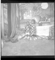 Full shot of two young girls standing, on the left wearing a camisole and pagne and on the right wearing a camisole and black and white pagne in the studio.
