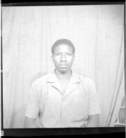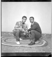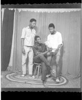 Three men, one wearing a shirt and pants holding a bowl and sitting in profile in between another man wearing a shirt and pants standing in profile and the other wearing a shirt and shorts standing in profile in the studio.