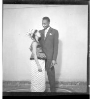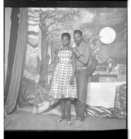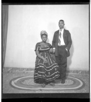 A man wearing a suit and tie holding a woman wearing a dress, pagne, and head wrap, both standing in profile in the studio.