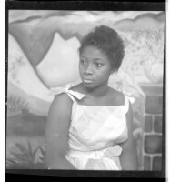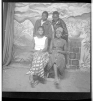 A girl wearing a dress and head wrap sitting in profile next to another woman wearing a dress and pagnes sitting face-forward' in front of two men wearing shirts and sweatshirts standing, one face-forward and the other in profile, in a studio decorated wi