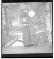 A girl wearing a dress and head wrap standing in profile in a studio decorated with a sun rising on a mosque and some surrounding trees.
