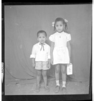 A little girl wearing a dress holding a little box next to a little boy wearing a shirt and shorts, both standing face-forward in the studio.
