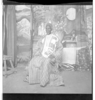 An old man wearing a boubou and hat sitting in profile in a studio decorated with a sun rising on a mosque and some surrounding trees.