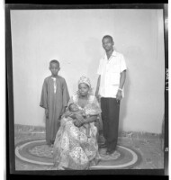 A woman wearing a dress and head wrap holding a baby on her lap sitting face-forward in between a man wearing a shirt and pants standing in profile, and a boy wearing a boubou standing face-forward in the studio.