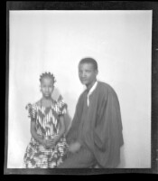A man wearing a suit and tie standing face-forward next to a woman wearing a dress and head wrap sitting face-forward in the studio.