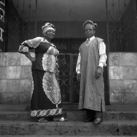 Man sitting, horse tail fly whisk on lap, hands on top, hat, a gourd with peace plant in on either side of him (one decorated). Format of original: 59mm x 59mm plastic negative