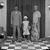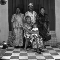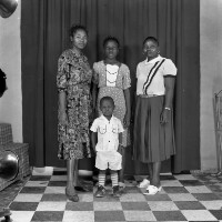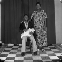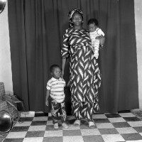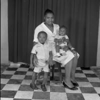 Three people: woman sitting on a stool with a baby on her lap, arm around a boy standing on her right. Format of original: 59mm x 59mm plastic negative