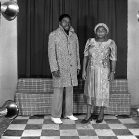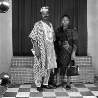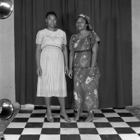 2 women standing: the one on the left in white pleated skirt and blouse, the one on the right in "pagne" outfit. Format of original: 59mm x 59mm plastic negative