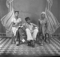 254. EAP054/1/81/309 Reference (shelfmark): EAP054/1/81/309 Title: Recreational photograph [c 1977] Scope & Content: Young man sitting between 2 young women. Format of original: 57mm x 59mm plastic negative Collection Area: Endangered Archives Programme Languages: Not applicable Date Range: c 1977 Extent: 1 TIFF image
