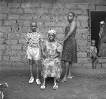 258. EAP054/1/81/350 Reference (shelfmark): EAP054/1/81/350 Title: Recreational photograph [c 1977] Scope & Content: Woman sitting a child standing on either side, in front of brick walled house Format of original: 55mm x 59mm plastic negative Collection Area: Endangered Archives Programme Languages: Not applicable Date Range: c 1977 Extent: 1 TIFF image