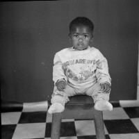 270. EAP054/1/46/531 Reference (shelfmark): EAP054/1/46/531 Title: Recreational photograph [c 1984 - 1985] Scope & Content: Baby sitting on a stool Format of original: 59mm x 59mm plastic negative Collection Area: Endangered Archives Programme Languages: Not applicable Date Range: 1984-1985 Extent: 1 TIFF image