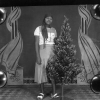 Young woman from Bamessingue standing, white top and pleated skirt, white shoes, left hand on a plastic tree, hair in dreadlocks. Format of original: 59mm x 59mm plastic negative