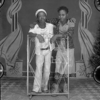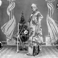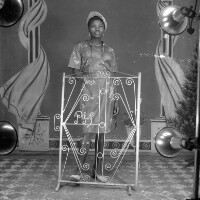 Young woman from Bagam standing, in patterned dress, hat and white shoes, earrings, hands on an iron grillwork. Format of original: 59mm x 59mm plastic negative