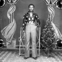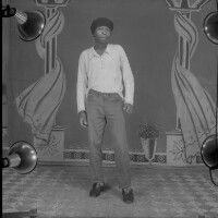 Man from Bamessingue standing, pale trousers and dark shirt patterned with white, left hand in pocket, dark shoes. Format of original: 59mm x 59mm plastic negative