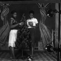 2 female friends from Bamessingue standing, one reading a book in white top and dark skirt with white shoes, the other in dark top and white skirt, dark shoes; a plastic tree between them. Format of original: 59mm x 59mm plastic negative